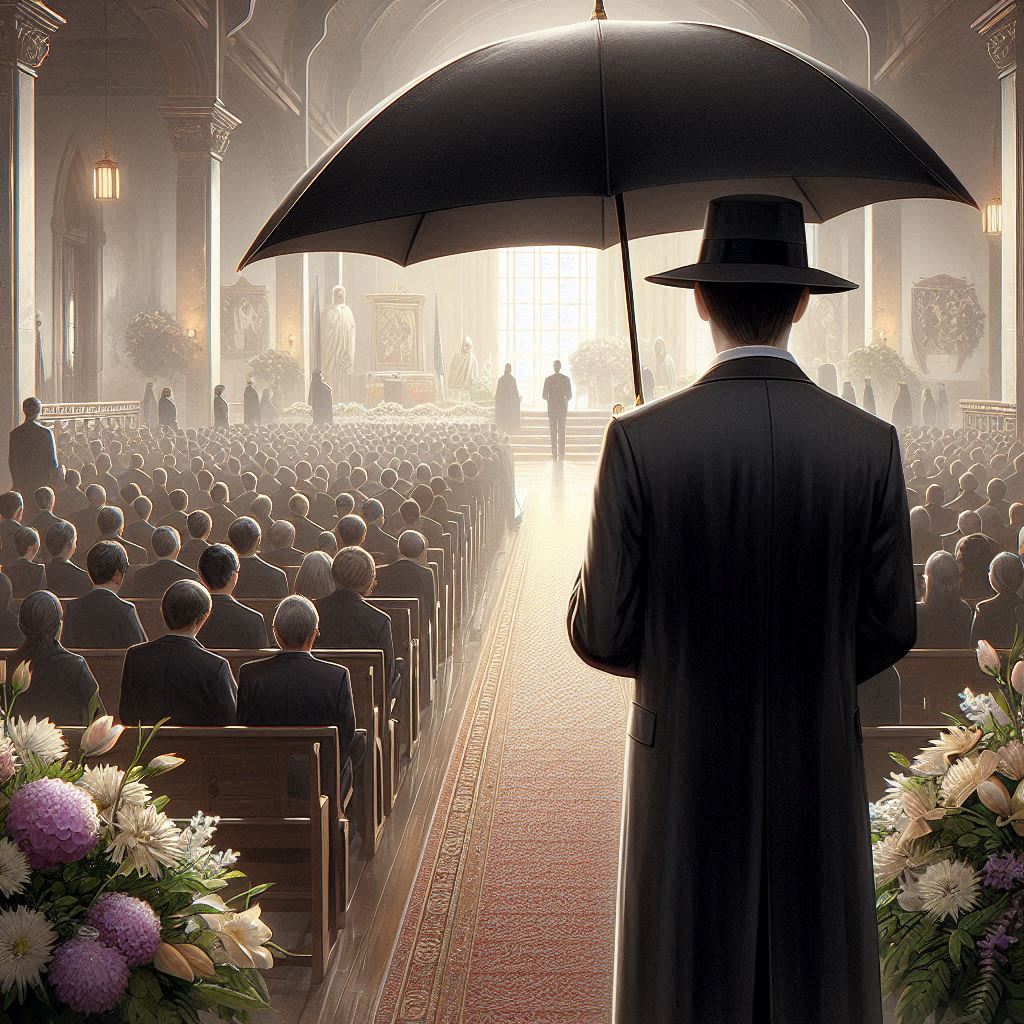 如果告別式當中,突然有一個神秘人士,身穿一身氣派正裝,手拿黑傘